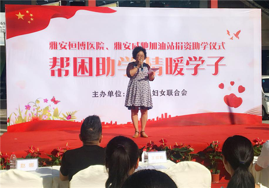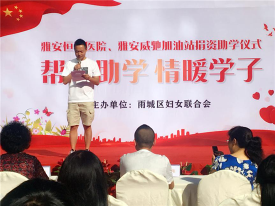 雅安恒博医院捐助田家炳中学学生 雅安威驰加油站、名山玉丰加油站捐助雅安第二中学学生 雨城区妇联主席王丽莉 区妇联主席王丽莉在捐助仪式上表示,区妇联一直以来都在组织团结社会力量,捐资助学。此次捐助的学生,都是家境贫困而又成绩优异的学生,他们都是今年的应届高考生,都以非常优异的成绩考上了大学。为了不让家境贫困挡住他们的求学路,特意为他们与社会爱心人士架起爱心桥梁,圆他们的大学梦。同时对此次捐资单位雅安恒博医院和雅安威驰加油站/名山玉丰加油站表示感谢,并希望受捐学生能够心存感恩,刻苦学习,将来能够更好的回报社会。 雅安恒博医院院长黄剑平 雅安恒博医院捐助仪式现场 作为捐助单位,雅安恒博医院黄剑平院长表示,医院一直把关注社会公益事业,当作我们医院文化的重要组成部分,积极开展各项社会公益活动。十年树木,百年树人;百年大计,教育为本。学生是祖国的未来,医院有责任关心下一代的健康成长。希望受捐助的同学们珍惜现在的学习机会,把对爱心企业的感激之情转化为学习的动力,继续奋发图强,学好本领,为国家建设出力,为社会发展尽责。