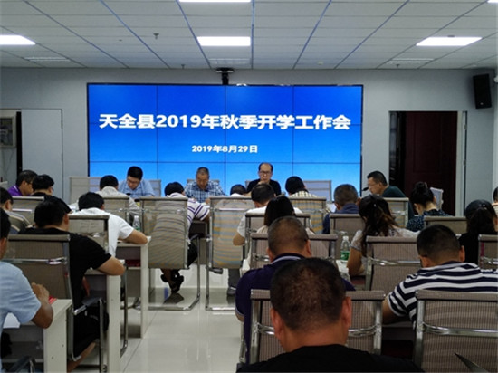 四川新闻网雅安8月29日讯(舒月 文/图) 为了进一步规范教育教学管理,加快推进新学期学校各项工作有序开展,8月29日,天全县2019年秋季开学工作会在天全县教育局八楼会议室召开。局党委班子成员、局机关各股室负责人和各中小学校(园)长共计60余人参加会议。 会议对“党建工作、意识形态工作、党风廉政建设、教育扶贫、教育督导、学校基建、校园安全”等工作进行了安排部署。要求各学校要进一步强化教育教学质量建设,奋力开启教育发展新征程;要集中精力聚焦办学质量,要认真准备,上好开学“收心教育、安全教育”第一课。