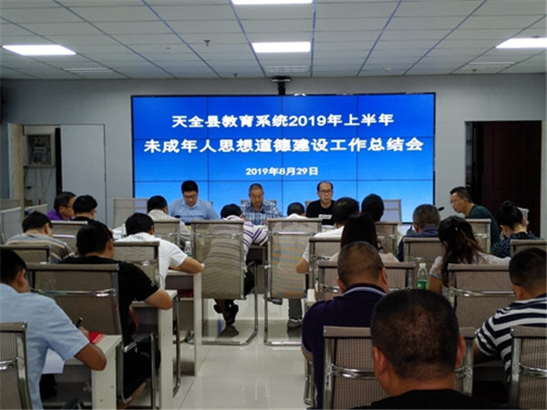 四川新闻网雅安9月4日讯(段光铨 姚志如 文/图)近日,天全县教育系统召开了2019年上半年未成年人思想道德建设工作总结会。县教育局相关负责人和全县中小学、幼儿园校(园)长40余人参加会议。 会议对全县教育系统2019年上半年半年未成年人思想道德建设工作进行了总结,对全县“立德树人”德育年活动推进情况进行了通报,组织学习了《雅安市2019年未成年人思想道德建设12项重点工程方案》,并对下半年工作进行了安排部署。