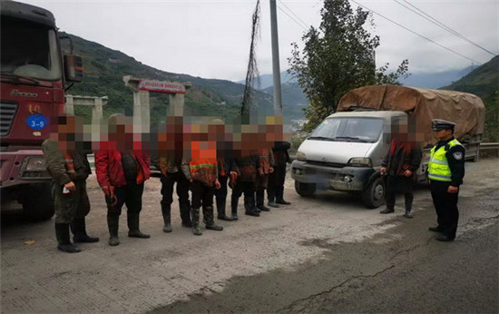 当日,认真分析辖区源头管理形势,摸排掌握重点车辆、重点违法规律及特点,合理布控警力,错时上路查控,在省道306线开展路检路查工作中,查获号牌川TRG0××的货运机动车非法载人的交通违法行为。经询问核查,该辆货运机动车货箱里搭载的8人均属峨汉高速公路施工单位工人,该货运机动车为送其上下班。