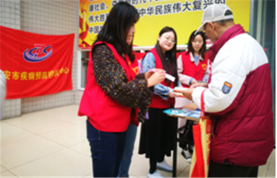 雅安市疾病预防控制中心分别于10月29日、11月12日,先后共组织中心志愿者12人次,联合雅安职业技术学院疾病与预防协会,走进雅安职业技术学院(青年路校区和经区校区),共同开展了以防治艾滋病、结核病、糖尿病,提升健康素养为主的健康教育志愿者服务活动。活动中,展出展板4个,悬挂横幅3条,发放健康宣传资料6种700余份。 健康教育志愿服务活动进机关
