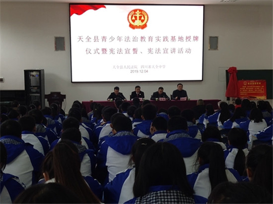 四川新闻网雅安12月6日讯(袁力 文/图)为预防未成年人违法犯罪,全方位保护未成年人合法权益,天全县依托“天全县青少年禁毒教育基地”,建立了“天全县青少年法治教育实践基地”,充分发挥天全中学法治教育主阵地的作用。12月4日,“天全县青少年法治教育实践基地”授牌仪式在天全中学举行。雅安市中级人民法院党组成员、副院长刘维秋,天全县委常委、政法委书记倪一航,天全县法院党组书记、院长秦明文等领导出席活动。