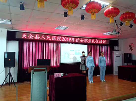 四川新闻网雅安12月6日讯 为了规范护理人员行为,加强护士礼仪修养,提高护士素质,塑造良好医院形象,营造健康向上的人文环境。近日,天全县人民医院在五楼学术厅举办了“2019年护士职业礼仪”培训,全院100余名护士参加。