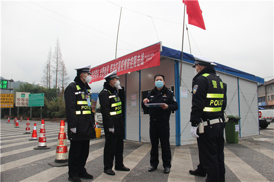 执勤民警在工作岗位上 检查点的临时板房,是近两天才搭建起来的。板房外面悬挂着一条醒目的标语:“党员带头,全警动员,坚决打赢疫情防控阻击战!”板房外面停着一辆移动警务车,这就是卡点执勤民警临时的“家”了。 孔杰,荥经县公安局交警大队花滩中队中队长,中共党员,一个身形瘦高的小伙子。自今年1月26日全县公安机关拉开疫情防控阻击战序幕以来,孔杰和他的战友们就积极响应党组织号召,假日无休日夜奋战在疫情检查的第一线,与卫生健康部门的白衣天使们一道,共同筑起守护荥经和谐安宁的铜钱铁壁。 支委成员、交警大队长卢怀彬向民警交代工作 打手势指挥车辆靠边停放,在防疫人员对乘员开展体温检测的同时,迅速问明司乘人员姓名、身份证号、电话号码等信息,逐一作好车辆号牌、进入时间等相关信息登记,确保“一车一查、一人一检”。