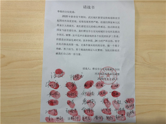 四川新闻网雅安1月29日讯 疫情在前,作为人民警察,责无旁贷。1月25日,全国首批枫桥式公安派出所雅安市公安局雨城区分局河北派出所全体民警、辅警自愿放弃休假,纷纷在请战书签名,主动请缨,做一个勇于奉献、勇于担当、勇于挑战的基层人民警察。无条件服从组织安排,24小时严阵以待,坚守抗击疫情第一线,党员民警更是主动冲到抗击疫情防控工作最前沿,全力以赴,攻坚克难,让党员的旗帜在这场战“疫”中熠熠生辉!(雨城区公安分局供稿)