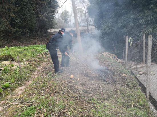正值初春,暖阳正盛,农田及房前屋后的野草繁盛且干燥,不规范使用明火极易引发火灾。2月26日17时许,芦阳派出所民警巡逻至佛图山隧道时,发现思延镇周村村顺河小区旁浓烟滚滚,起火原因不明,民警立即赶到顺河小区,但车辆无法到达起火点位置。因无法明确火势,且非常靠近居民区,火势一旦蔓延,后果不堪设想。为避免火势扩大,造成严重后果,民警立即下车,跑步前往起火点。面对滚滚浓烟,在场民警齐心协力,就地取材,成功将明火扑灭。经过反复确认无复燃危险后,民警才放下心来。