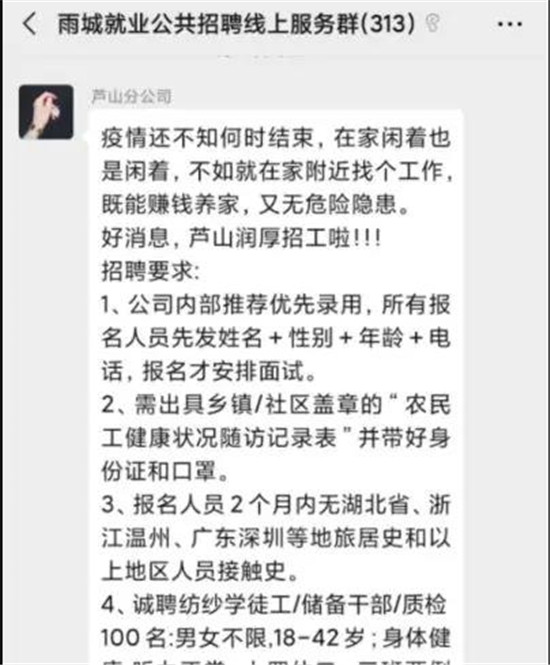 四川新闻网雅安2月28日讯 当前正值新冠肺炎疫情防控的关键时期,也是企业复工复产急需用人之际,为助力企业复产用工,雨城区人社部门暂停了各类现场招聘活动,将2020年春风行动暨就业援助月活动由线下转为线上,通过网络发布岗位和求职信息,提供线上公共就业服务,为农村富余劳动力、返乡农民工等重点群体搭建起网上对接平台;同时,精准对接企业,协助解决用工需求,并采取扩员、减费、奖补等多种措施支持企业稳定岗位,有序复工复产。 “四级一体”构建市区镇村岗位快速推送机制。通过市、区、镇(街道)、村(社区)农民工服务中心(站)和散布在村、组、小区(大院)的疫情监测网格员,采取“线上+线下”等方式实施网格化定向推送。同时,还利用农村“村村响”大喇叭播放用工信息,让用工信息走进农家院落,人人知晓。 “一员一企”保障重点企业和建设项目劳动用工。建立健全24小时重点企业复工复产服务保障工作机制,设立“人社服务专员”,实行“一企一员”“一员多企”,定向定点、定人定岗网格化联系服务重点企业和重大建设项目,在广泛宣传周知的同时,建立专属联系微信群,精准推送相关支持政策优先发布用工信息,实行重点企业复工复产 “日报告”制度,掌握企业与劳动用工对接签约情况,每日报送企业生产经营和用工状况,建立企业需求台账。 “三方互通”建立用工信息快速反馈机制。建立牵头部门、镇(街)、企业三方联动机制和信息互通机制,从村(社)劳动保障员和防疫网格员上门收集农民工就业意愿、企业每日报送反馈农民工签约情况、区就业促进中心人力资源市场电话接受用工登记微信收集反馈情况3条线同步收集掌握农民工就业诉求,建立农民工就业数据库。 “一对一”搭建精准推送快速通道。结合农民工就业意愿调查、企业用工需求调查,准确建立农民工就业意愿数据库和重点企业用工需求台账,专人动态跟踪企业需求,“一企一策”精准匹配求职数据库,做到“需求到、云匹配、闪对接”。 “不见面”推动线上服务稳就业。为方便公共就业服务对象,减少人员聚集,阻断疫情传播渠道,区人社部门开展“互联网+”就业创业服务,推行“不见面”办理,为劳动者和用人单位提供就业、技能培训、创业培训、社保、档案查询及各类就业补贴申报等线上公共就业服务。