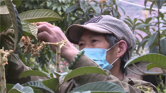 万启超说:“ 以前,每年我们种的庄稼虽然多,但是刚刚够吃,家里主要收入全靠打工,脚受伤以后不能打工了,党委政府帮扶我发展产业,开始种起了枇杷。”