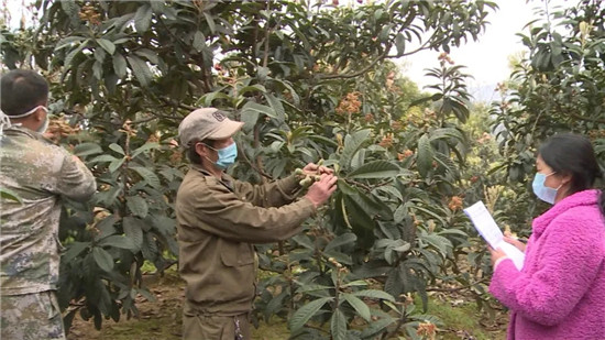 万启超在管护枇杷的过程中遇到难题后,第一时间向他的帮扶责任人白娇求助,随后,白娇联系了镇上和村上的农技员、土专家来到他家果园开展田间“一对一”果树管护指导。