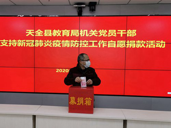 四川新闻网雅安2月29日讯 2月27日,中共天全县教育局机关总支部委员会组织全体党员开展了“支持新冠肺炎疫情防控工作”自愿捐款活动。47名党员纷纷走到捐款箱前,捐出自己的一份心意,表达对新冠肺炎疫情防控工作的支持,共计捐款3420元。 在这场没有硝烟的战斗中,天全县教育局机关党员干部始终走在抗击疫情第一线,在做好全县教育系统疫情防控工作的同时,积极组织参加联防联控工作,当好宣传员、作战员,以实际行动增强“四个意识”、坚定“四个自信”、做到“两个维护”,彰显党员干部的初心与担当。(天全县教育局供稿) |