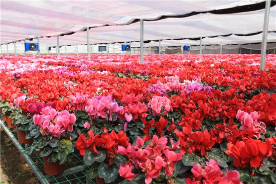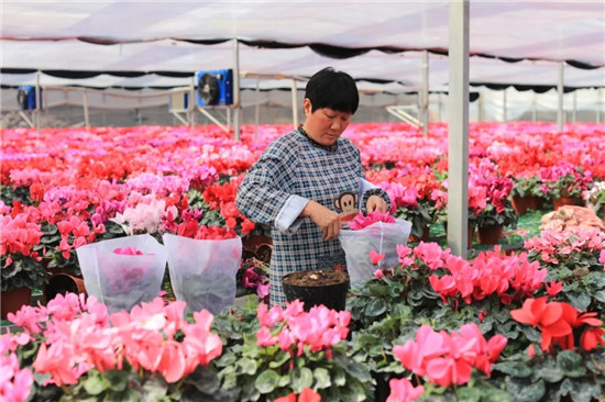 仙客来:汉源县前域镇花卉种植专业合作社内,工人正在打包发往成都的鲜花,花名“仙客来”。