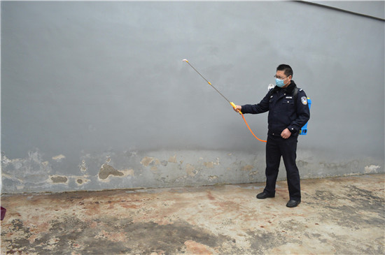 2月2日一早,大家刚刚起床洗漱、正在搞个人卫生的时候,作为最先进入看守所隔离区的监管党支部副书记贾建茂,已经背着消毒器在给各监室、办公区进行地面、墙面消毒。