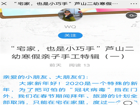 四川新闻网雅安3月18日讯(赵国芳 田崇夏 文/图)芦山县第二幼儿园迅速部署, 线下线上齐发力认真开展疫情防控的各项工作,宣传到位,防控到位,确保延迟开学停课不停教,停课不停学。