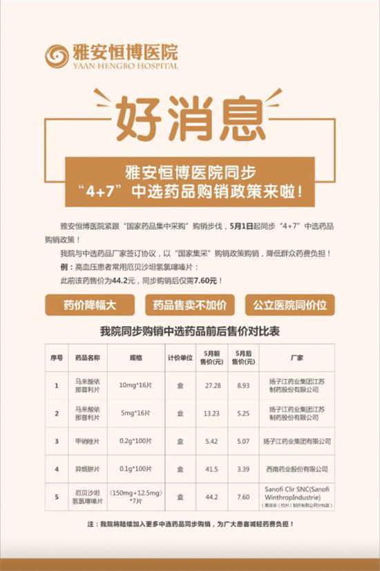 四川新闻网雅安5月7日讯 日前,本网从雅安恒博医院了解到,今年5月1日起,雅安恒博医院上线医保“4+7”集采药品,这意味着广大患者即日起可在雅安恒博医院购买到国家集中采购的部分中选药品。 笔者从雅安恒博医院的药品采购处获悉,雅安恒博医院作为民营企业,积极跟进国家药品集中采购的惠民政策,虽未加入到国家集采项目组织中,但为了给广大患者减轻用药负担,雅安恒博医院同“4+7”中选药品厂商签订协议,以“国家集中药品采购”的购销政策进行购销,实现中选药品“药价降幅大,售卖不加价,公立医院同价”,为医院患者切实减轻药费负担。 1日早上9点,患高血压10余年的王大爷照常到内科门诊开药。处方中的药物还跟以前一样,价格却少了很多。原价格为27.28元/盒(10mg*16片/盒)的马来酸依那普利片,今天的处方上显示为8.93元/盒(10mg*16片/盒)。