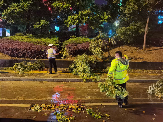 四川新闻网雅安5月7日讯 5月5晚21时许,一场狂风暴雨骤降汉源,辖区多处树木被风吹倒、井盖被水流掀开并移位,给辖区群众出行带来严重安全隐患。22时许,汉源县公安局交警大队警员迅速行动,组织警力在雨中坚守主要道路、积水点指挥疏导交通,无论是被刮倒的树木还是被水流掀开的井盖,大队警员都及时清理,并提醒司机要耐心等待通行或提示司机绕道通行。