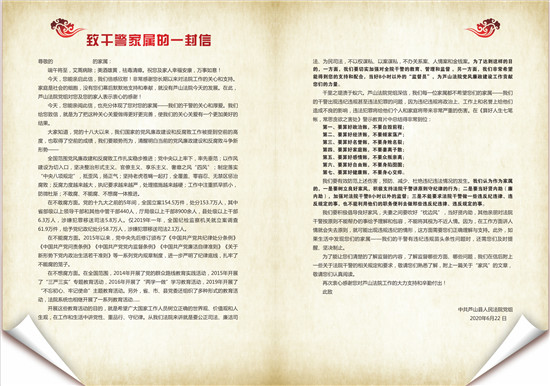 芦山县人民法院党组始终把党风廉政建设工作作为法院工作的重中之重,常年采取廉政谈话、警示教育、纪律检查、执纪督察等手段,狠抓干警纪律作风建设。致干警家属的一封信,目的就是多途径延伸廉政触角,延长防腐链条,筑牢干警拒腐防变防线。 在端午佳节这个传统佳节到来之际,法院干警子女也通过诵读千古美文,弘扬传统文化,唱响了爱国主义主旋律。