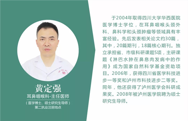据了解,黄定强:耳鼻咽喉科 主任医师,于2004年取得四川大学华西医院医学博士学位,在耳鼻咽喉头颈外科、鼻科学和头颈肿瘤等领域具有丰富经验。2006年,获得四川省医学科技进步一等奖和泸州市科技进步二等奖。同年,他还获得了泸州医学会科研成果奖。2008年被泸州医学院聘为硕士研究生导师。