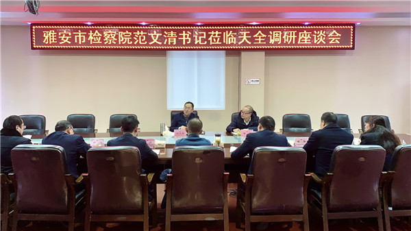 四川新闻网消息 1月5日,雅安市人民检察院党组书记、代理检察长范文清到天全县人民检察院调研指导工作,并集中走访天全县委书记余力、县人大常委会主任陈颖、县政府县长郑胡勇、县政协主席李家顺,主动征求对检察工作的意见建议。天全县委常委、政法委书记倪一航,天全县检察院党组书记、检察长邹君,市检察院办公室主任米建陪同调研,天全县检察院全体班子成员及各部门负责人参加调研座谈会。
