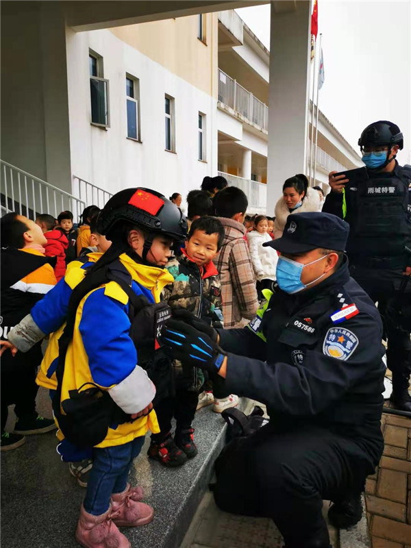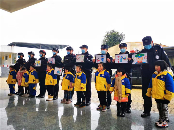 演练结束后,雨城区公安分局特巡警大队陈警官对演练进行了总结,给小朋友们讲解了“自我防护”的一些方法。逐一展示了日常特警装备,孩子们望着高大、帅气的特警队员,眼中闪烁着好奇。孩子们通过摸一摸、穿一穿、试一试,轮流走上特警车参观、体会、合影,直观的了解了警察的工作性质,对警察叔叔的崇敬之情油然而生,同时也感受到了警察叔叔工作的辛苦和自己被保护的安全感,孩子们将自己的感恩之情融入绘画作品,将作品送给他们心中的英雄。