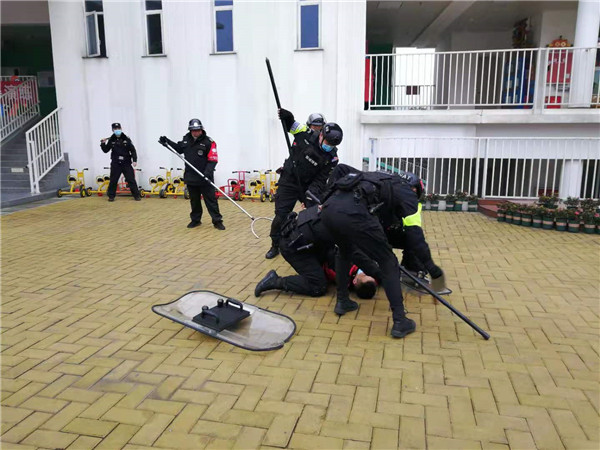 上午10点,正是孩子们早操活动时间,“歹徒”翻墙持刀冲进幼儿园,门口保安迅速启动一键报警装置、按响警铃并奋力阻击“歹徒”。全园教师即刻组织幼儿按照预定路线迅速跑回教室关紧门窗躲避,保持安静,保安叔叔手持棍棒、钢叉等,与“歹徒”交涉、周旋,在最危急的时刻,草坝派出所民警和特警大队民警迅速赶到,成功将“歹徒”制服……