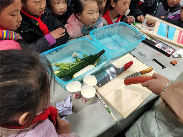 活动中,一、二年级通过认识各种厨具、调料,了解厨具的作用,激起学生热爱劳动的兴趣;三、四年级观看教师做菜,学习方法,自己动手制作简单的凉菜等,锻炼学生动手能力;五、六年级学生动手制作了薯条、汤圆、寿司等,大家合理分工,洗菜、择菜、做菜、收拾并清洗厨具。
