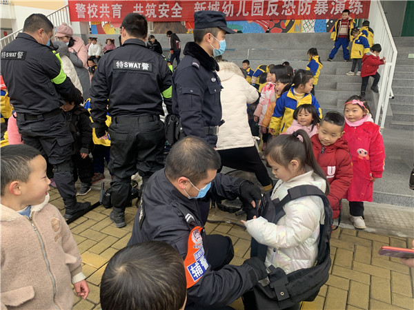 演练开始,“歹徒”持刀强行闯入校园,保安人员迅速按响一键报警器,师生们迅速按照预定路线有序撤离到安全区域,同时做好自身防护。民警第一时间赶到现场,迅速把“歹徒”制服。演练结束后,民警对在场师生进行了安全培训,详细讲解了安全上下楼梯、交通安全,以及发生地震时有序逃生等知识。讲解过程中,民警通过现场互动的方式,带领小朋友们参与进来,活动现场气氛活跃热烈。