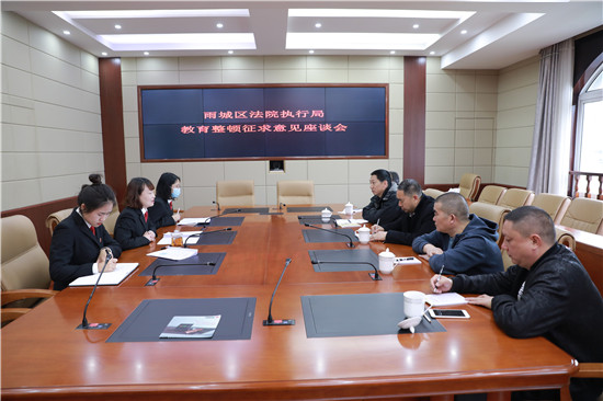 四川新闻网消息(李姣)3月24日,雅安市雨城区法院执行局召开政法队伍教育整顿征求意见座谈会,邀请部份党代表、人大代表、政协委员到该局听取第一季度执行工作情况汇报,并诚恳征求对执行工作及执行队伍建设的意见建议。