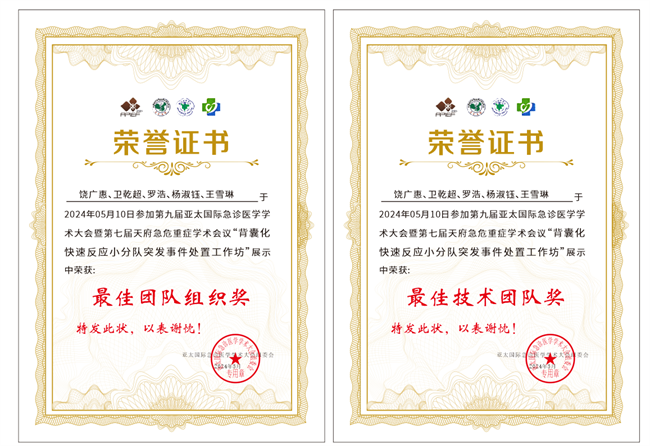 饶广惠和雅安市其余3家医院派出的队员共同组成雅安代表队并担任队长,参与“背囊化快速反应小分队突发事件处置工作坊”竞赛,在紧张激烈的角逐中脱颖而出,荣获“最佳团队技术奖”“最佳团队组织奖”2项大奖。