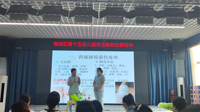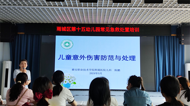 四川新闻网消息 5月23日下午,雅安职业技术学院附属医院第一党总支第五党支部医护人员走进雨城区第十五幼儿园,为雅安实验幼儿园教育集团(雨城区汉碑幼儿园、第九幼、第十五幼、第十七幼、第十八幼)的老师、保育员、安保人员,进行了关于儿童意外伤害防范与处理的培训。