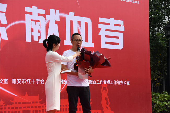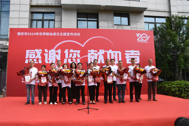 活动中为雅安市热血20年无偿献血代表,雅安市无偿献血、造血干细胞捐献三免博爱卡优待对象代表颁发了感谢状;为联合推动雅安市无偿献血、造血干细胞捐献三免博爱卡出台的单位赠送了锦旗。