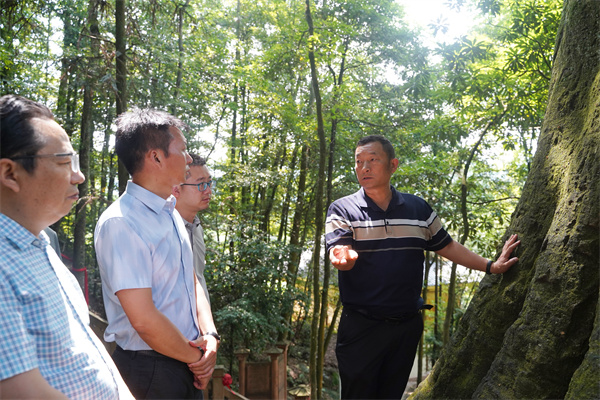 由市、区林业局、雨城区作家协会及碧峰峡镇相关负责人组成的考察团对千年红豆古树保护工作进行现场调研。