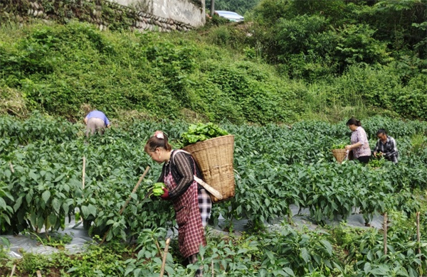 昝村村1组村民陈仕英在青椒田里忙得不亦乐乎,只见她背着背篼,不时弯腰摘下一个又一个大青椒,然后将青椒往身后的背篼一放,动作熟练而麻利,不到10分钟,青椒已经装满整个背篼。