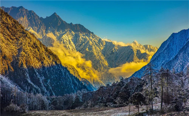 贡嘎之南秘境·田湾河。田湾河位于石棉县境内,距县城46公里,景区面积380平方公里。田湾河发源于贡嘎山南坡,景区沿河延伸,10多余座海拔在5000米以上的山峰终年积雪,山势逶迤,重峦叠嶂,山峰尖峭,白雪皑皑,“日照金山”分外壮观,是贡嘎山著名的一大景观。