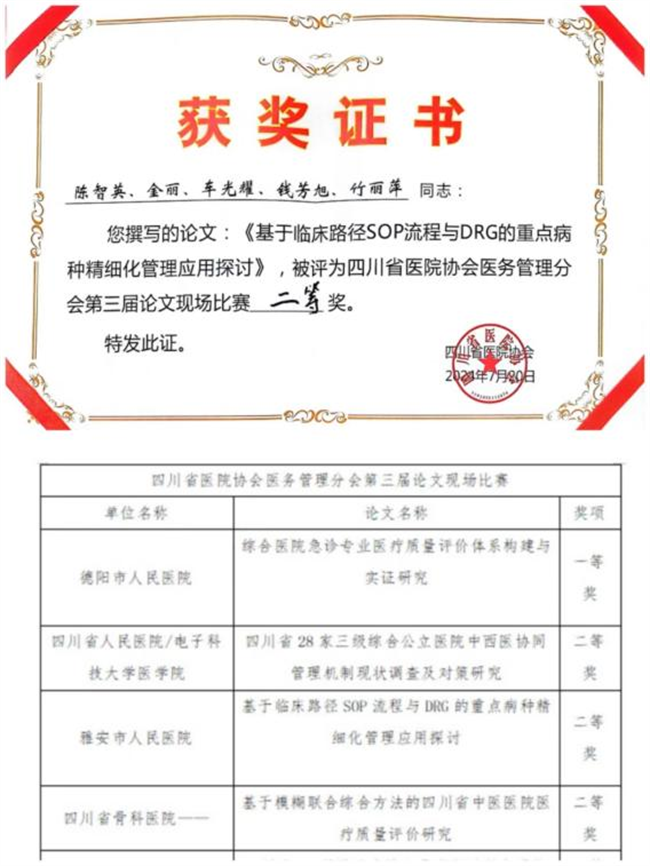 四川新闻网消息 为进一步助推“以人民健康为中心”优质高效的医疗服务体系建设,改善医疗服务,近期,四川省医院协会第三届医务管理分会学术培训暨科研立项与论文大赛在成都金河会议中心举行。雅安市人民医院(四川大学华西医院雅安医院)副院长杨晓茂带队参赛。历经案例征集、专家评选后,医院医务科报送的论文《基于临床路径SOP流程与DRG的重点病种精细化管理应用探讨》进入决赛,并在决赛中以第3名成绩取得二等奖。