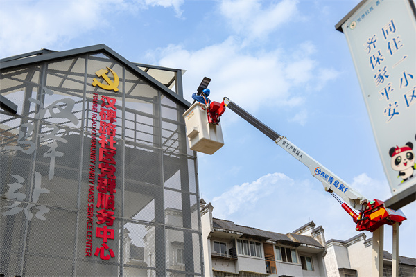 固定支架、安装U型架、装上太阳能光伏板、连接太阳能灯,路灯调试、太阳能板角度测试,队员们站在高空作业车上,迎着烈日开展施工。他们分成两支小队同步开展安装,于当天下午完成安装任务。新装路灯13盏,满足小区731户群众的夜间公共区域照明。