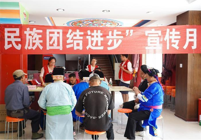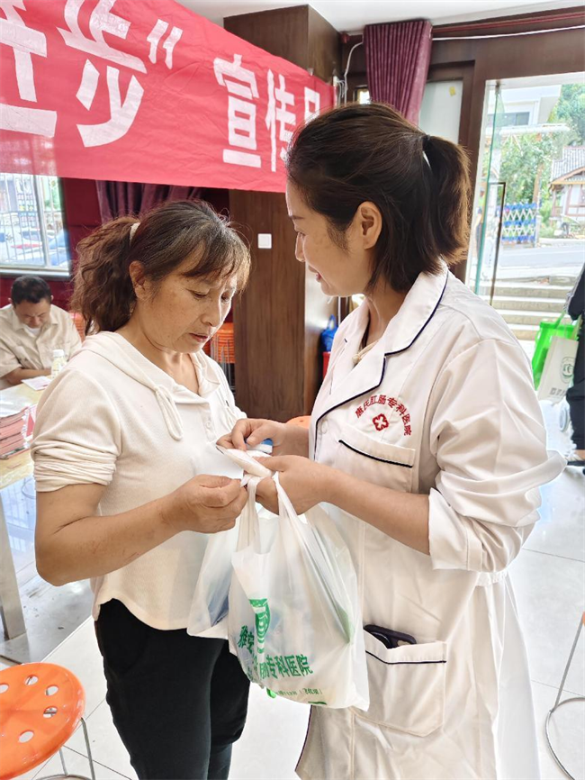 宝兴县委统战部组建的“同心·服务团”志愿者们现场为群众发放了相关宣传资料和同心小物件,把方针政策送到群众“心尖上”,把关怀和实惠送到群众“家门口”。