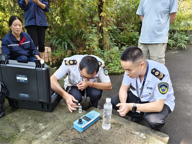 卫生执法人员重点对供水单位原水取水口、加药车间、消毒车间等关键场所进行检查,详细查看供水单位供水设备运行、消毒设施运转是否正常、是否建立汛期饮用水安全应急处置预案和24小时值班巡查制度、是否加强水源水、管网水、出厂水水质监测并做好检测记录、以及消毒、水处理剂存放使用情况等。同时,执法人员现场取样,使用快速检测设备对供水单位出厂水消毒剂含量进行现场检测。