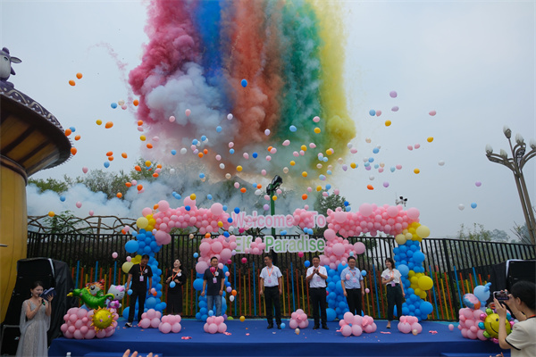 开园典礼上,主持人发布为期10天的“FUN 肆趣玩·嗨翻国庆”游园活动,随着无数色彩斑斓的气球腾空而起,“梅花谷·精灵乐园”也正式开园。