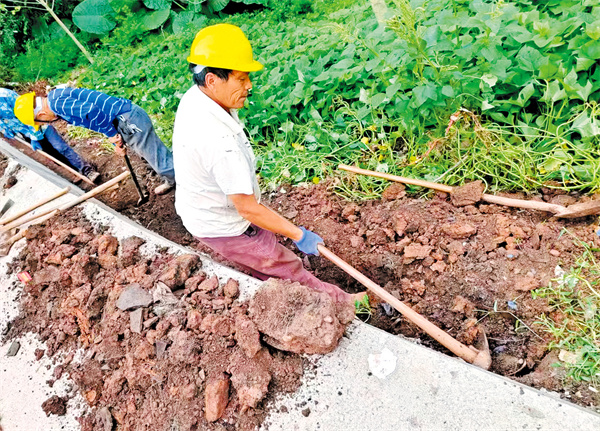 更多负责开挖管沟的村民,则按照不同施工面所在位置,来自不同村民小组。为加快施工进度,施工方采取了聘用工人开挖,以及将工段承包给村民的方式进行。