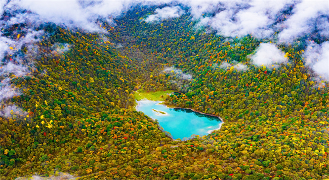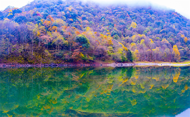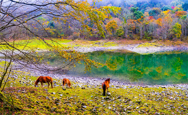 拖乌山的山坳里,隐藏着一个宁静的小湖,当地的彝族同胞叫它月亮湖。秋天的月亮湖长时间被彩林和薄雾包围,枫叶红艳似火,湖水湛蓝如玉,连香金黄成霞,雾霭漫过山岗……所有的色彩仿佛开始流动,只有湖水静静地把这一切色彩倒映其中,这一刻,所有的语言都无法形容这种多彩之美,只好让那微风吹落一地红叶,在林间洒满秋的诗句。偶尔溜进来的几匹马儿,也沉醉在这五彩斑斓的画卷里忘了吃草,只是静静地站立在湖畔,感受着深秋的气息,成为风景,成为传奇……