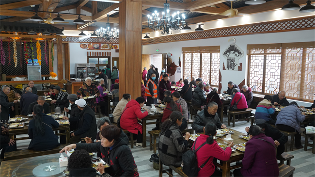 上午11:30,菜品全部出锅,老人们在工作人员的引领下,有序打餐就餐。灰色墙体、仿古门窗、中式桌椅……城中社区善食食堂位于人民路东一段168号,占地面积约300㎡,可以同时容纳约100人用餐,走进食堂,宽敞明亮的环境、温馨整洁的装修,都让人眼前一亮,不一会,居民们的餐盘里就垒起了一座座小山,饭碗、菜盘放得满满当当的。“好吃,分量也足,真不错!”就餐居民们高兴地说。