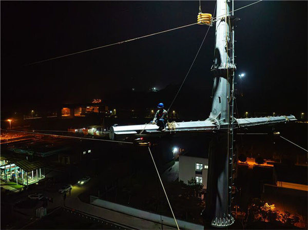准备工作就绪,安全负责人通过对讲机发出指令,十余名电力工人整齐划一,迅速向数十米高的铁塔顶部攀爬。张力场中,机械启动,人机协同,导线缓缓从NB1号铁塔和NB1号铁塔向远方延伸。在凛冽寒风下,铁塔上的电力工人,随着导线展放,有序开展作业。