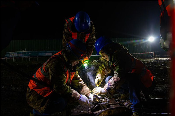 00时30分,张力场内,吊车就位,“粗壮”的导线成捆摆放,多基铁塔灯光亮起,60余名电力工人严阵以待。
