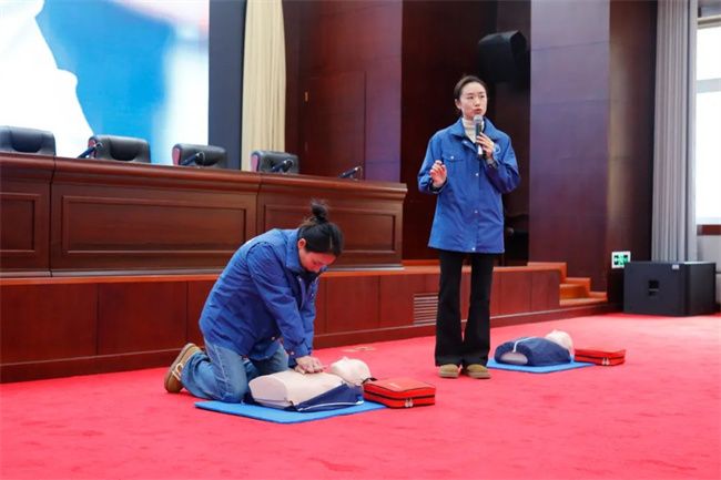 雅安市紧急救援中心两位老师采取理论讲授与救护技能实操相结合,详细讲解了救护概念、认识心脏骤停、心肺复苏操作以及常见突发事件的处理方法。讲授心肺复苏(CPR)和自动体外除颤仪(AED)的操作使用方法。
