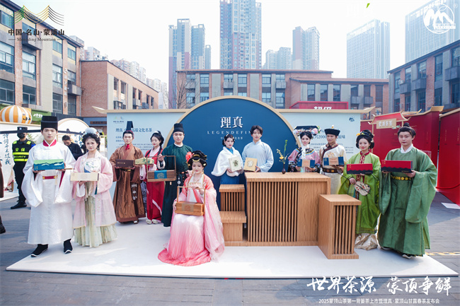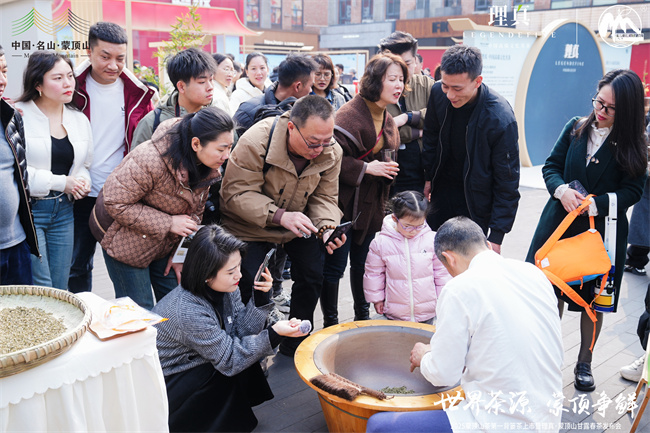 当天下午,来自雅安名山的蒙顶山茶企代表进行了品牌推介,现场还开展了蒙顶对诗大赛,设置蒙顶贡茶文化巡展、宋代点茶体验、古装打卡等精彩活动,更有省级非遗大师现场炒茶,吸引了众多嘉宾及游客沉浸在这场蒙顶山茶的盛会之中。活动现场还以国风大秀的形式,12位演员身穿汉服携理真代表产品,向观众行礼致敬,呈现出一部生动的蒙顶山茶史。(图片来源:名山区委宣传部)