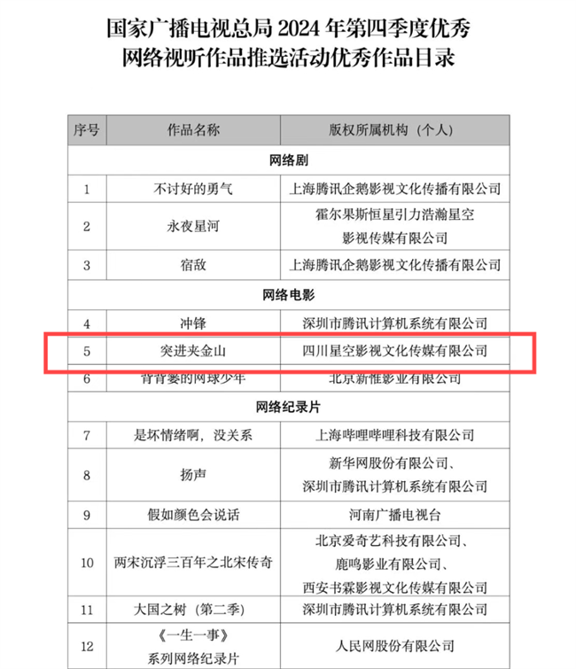 近期,国家广播电视总局组织开展了2024年第四季度优秀网络视听作品推选活动。经省级广电行政部门和中央直属单位等推荐,专家评审委员会评审,革命题材网络电影《突进夹金山》入选网络电影优秀作品。此外,《突进夹金山》还成功入围第四届香港紫金花国际电影节。
